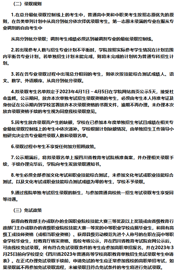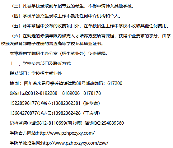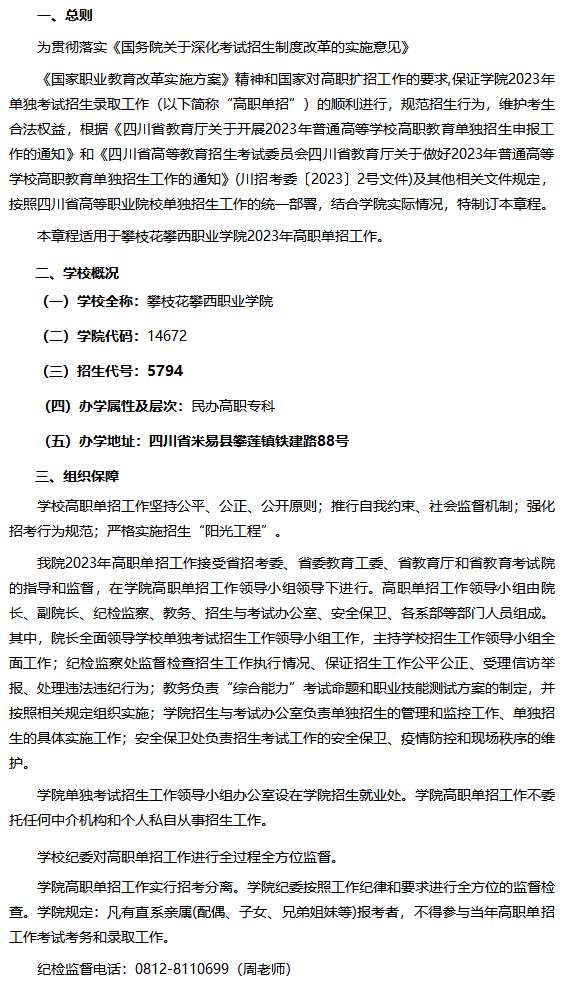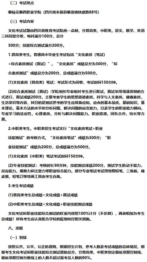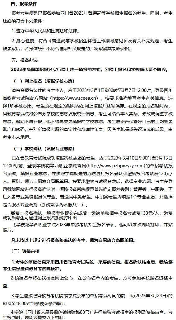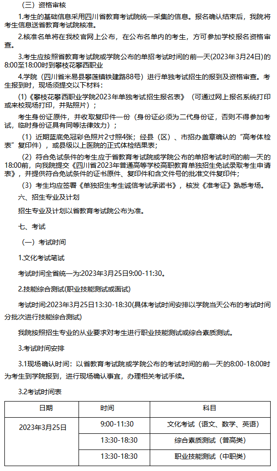 攀枝花攀西职业学院2023年高职教育单独招生章程